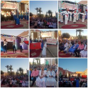 وبعد ذالك أدت فرقة من فتيان عرضا من رياضة فنون القتال التكواندو و فرقة لطبول قدمة وصلة جميلة ، ليكون الجمهور على موعد مع وصلة فنية من الغناء الشعبي للفنان ” الدجايجي ” الذي ألهب المنصة والجمهور معا من خلال أغاني شعبية ووطنية لقيت تجاوبا من الجمهور المتعطش لهذا الفن ، تلاه على المنصة مجموعة صحراوية حسانية التي أطربة المشاهدين فقرات فنية و رقصات ، و ختام هذه السهرة التي حج أليها الجمهور وادنوني تم تفريق تكريمات التي كانت أربرزها تكريم لولاية كلميم وادنون و مندوبية الثقافة بجهة كلميم وادنون ، لترفع برقية ولاء وإخلاص إلى جلالة الملك محمد السادس نصره الله و آيده.