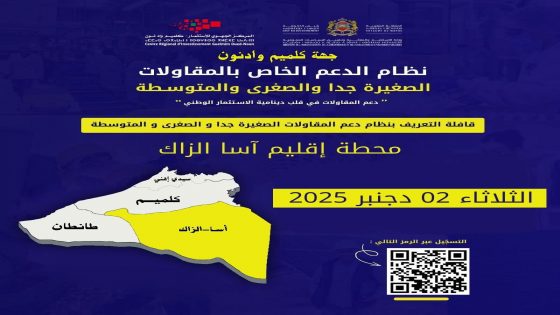 أعلن المركز الجهوي للاستثمار لجهة كلميم واد نون عن تنظيم المحطة الثانية من القافلة الجهوية للتعريف بالميثاق الجديد للاستثمار وبرنامج الدعم المخصص للمقاولات الصغيرة جدا والصغرى والمتوسطة، والتي ستقام يوم الثلاثاء 2 ديسمبر 2025 بإقليم آسا زاك ابتداء من الساعة 10:30 صباحا. تأتي هذه المبادرة في إطار استراتيجية المركز الجهوي للاستثمار الرامية إلى تقريب خدمات الدعم من الفاعلين الاقتصاديين المحليين وتمكينهم من الاطلاع على المستجدات القانونية والتشريعية التي تحكم الاستثمار بالمغرب، وتعزيز فرص نمو المشاريع الصغيرة والمتوسطة في الجهة.
