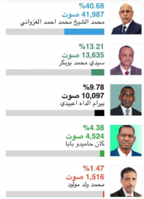 وصبيحة اليوم الاحد أعلن مرشح الحزب الحاكم محمد ولد الغزواني فوزه من الدورة الأولى للاقتراع، في حين لا تزال عملية فرز الأصوات جارية، بيد أن المعارضة شككت في النتائج وأعلنت رفضها.